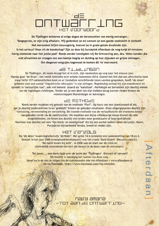 Deze keer was die opgebouwd uit een aantal 'Prenten Plus'. Rondom de komst van 'De 4man' verschenen, met een zekere onregelmaat, een aantal intrigerende nieuwsbrieven met raadselachtige teksten rondom De Tijdlingen. Rode draad binnen De Tijdlingen is de aanwezigheid van een ruim gesorteerde taalklank in ons land, waarbij vrijelijk mixen meer en meer acceptatie weet te verkrijgen. Inmiddels zijn we een vol tijdbrok verder en De Tijdlingen herleefden. Vlak voor het verscheiden van 2014 verscheen de eerste in de nieuwe reeks en er volgden er dra meer.