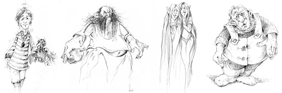 Een aantal van de illustraties voor het boek Peter en de Steen van Mu.
